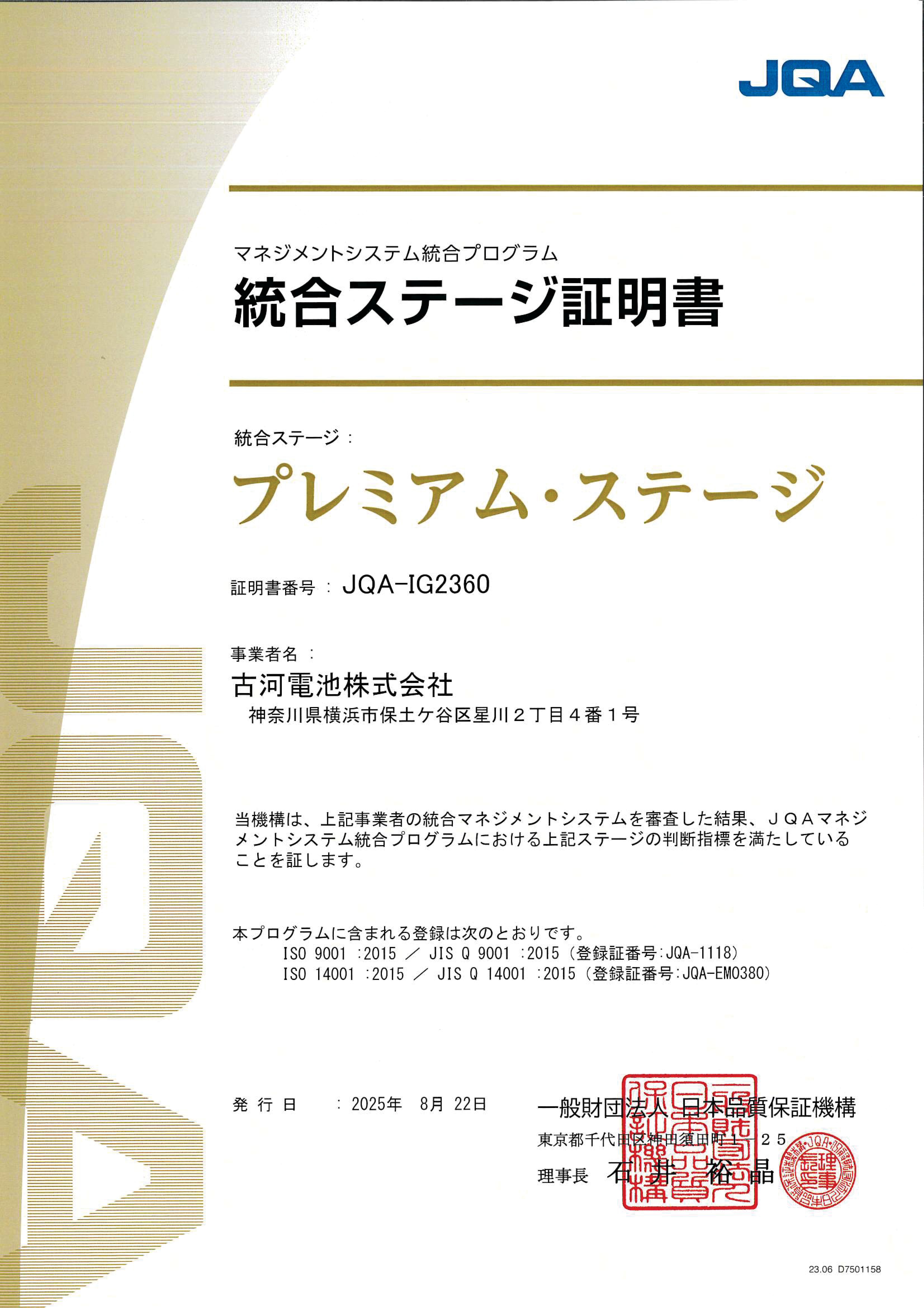 一般財団法人 日本品質保証機構(JQA)が提供する「マネジメントシステム統合プログラム」において、当社は「プレミアム・ステージ」の認証を受けております。