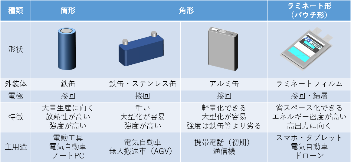 リチウムイオン電池のセルの製造方法は捲回(けんかい)式と積層式があり、形状から円筒形(Cylindrical)、角形(Prismatic)、ラミネート形(Pouch)などの種類があり、それぞれの特徴もあります。