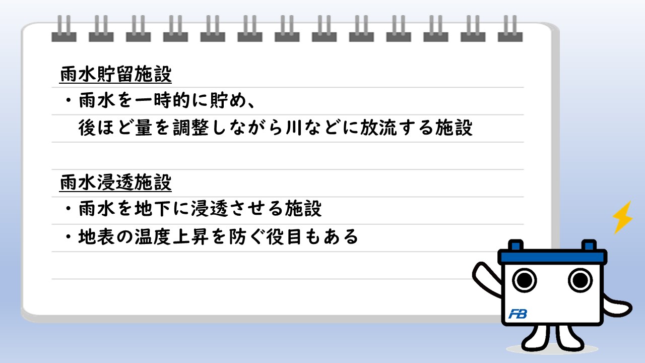 雨水浸透施設は、雨水を地下に浸透させる施設のことで、地表の温度上昇を防ぐ役目もあります。