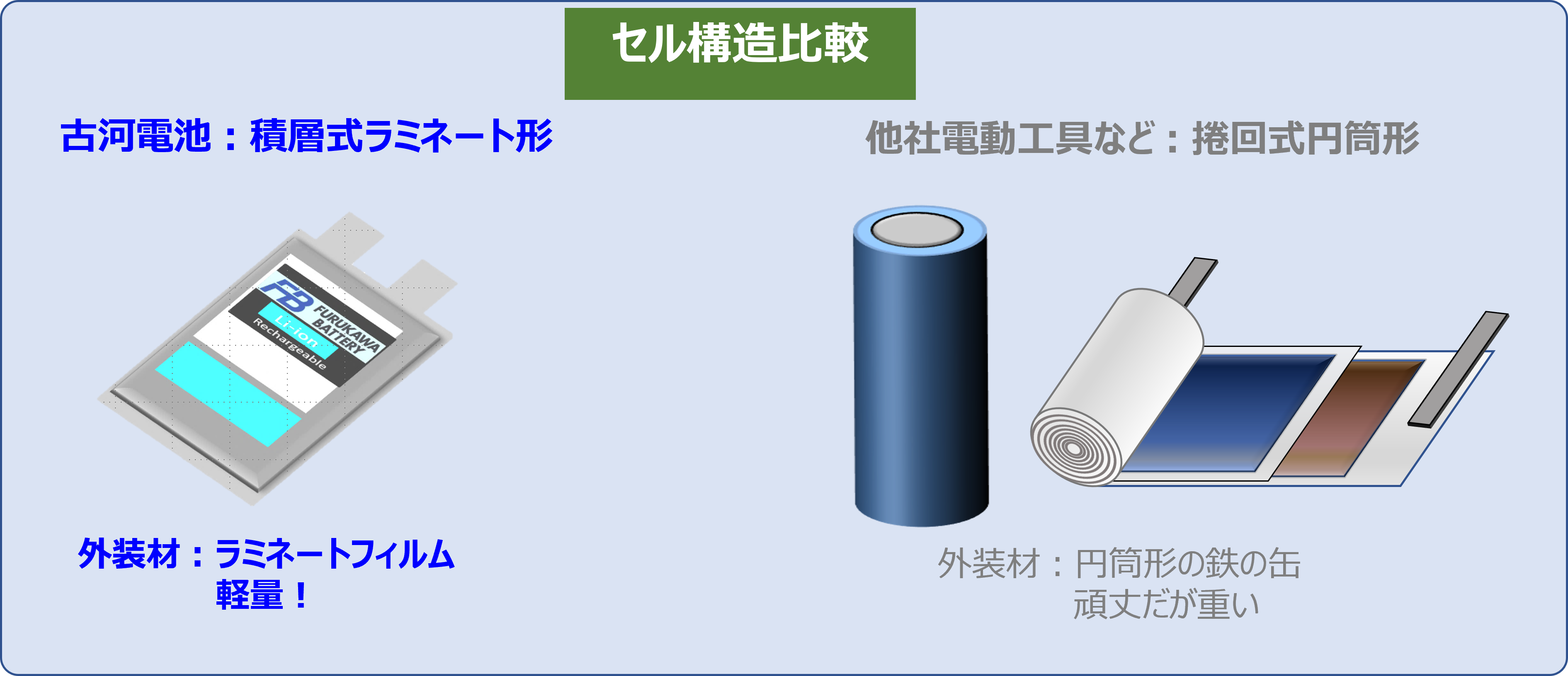 一方、円筒形や角形のリチウムイオン電池は鉄などの金属の缶に電極を挿入します。外装材として堅牢ですが重量は重くなります。